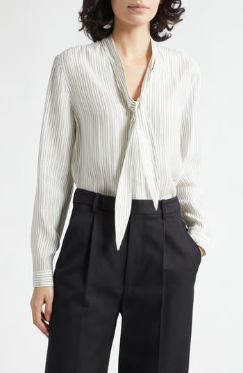 A V-neck closed with a sweet bow switches up the style profile of a crisp button-up marked by slim stripes.