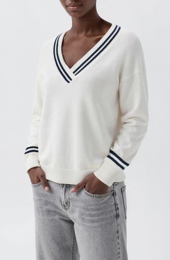 Add a bit of retro-sporty style to your look with this lightweight cotton-blend sweater traced with striped trim at the neckline and cuffs.