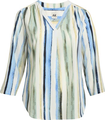 Blurred stripes enliven this smooth V-neck top finished with a tuckable curved hem.