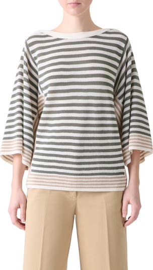 A sweeping boat neckline and voluminous quarter-length sleeves infuse this colorblock sweater with poetic charm. Knit from soft virgin wool with airy open stitches and patterned with variegated stripes, it’s a masterful study in texture and movement.