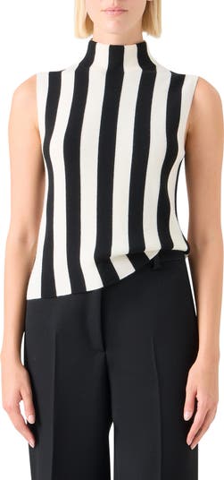 Bold stripes bring clean contrast to a mock-neck tank knit from warm virgin wool for season-spanning appeal.