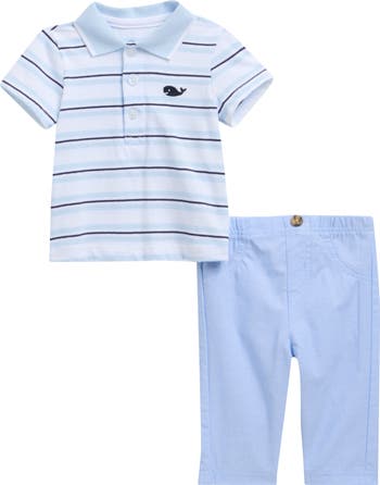 Your little one will be picture-perfect in all-cotton pants paired with a striped polo embroidered with a happy whale on the chest.