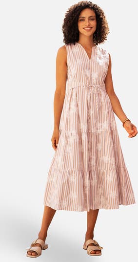 This breezy cotton midi dress blends effortless comfort with refined detail. Its soft vertical stripes are paired with delicate tonal embroidery, adding a subtle feminine touch. A notch neckline and adjustable waist tie create a flattering silhouette, while the tiered skirt offers graceful movement—perfect for warm days and relaxed outings.