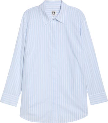 Slightly dropped shoulders relax the fit of this button-front shirt fashioned from stretch cotton and patterned with crisp, classic stripes.