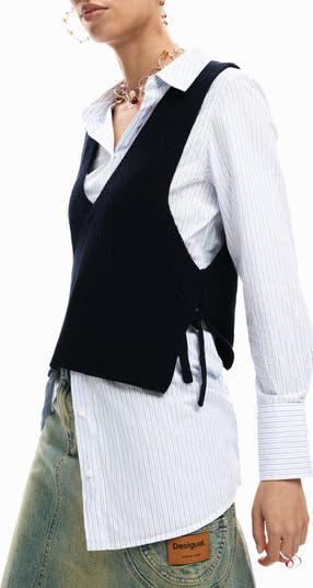 - Removable sweater-vest has deep V-neck