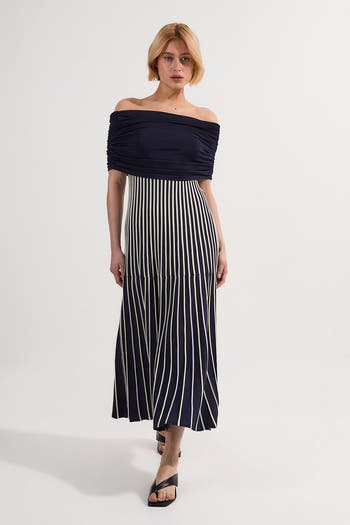 This striking Striped Bardot Knitted Maxi Dress from Karen Millen combines contemporary design with timeless elegance. The sophisticated off-shoulder neckline creates a flattering frame for your decolletage, whilst the ruched bodice adds texture and visual interest. The dress transitions beautifully into a striped skirt that elongates the figure and creates a captivating visual rhythm as you move.