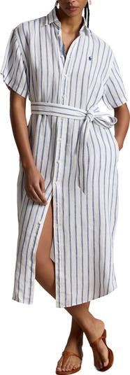 Striped Belted Linen Midi Shirtdress