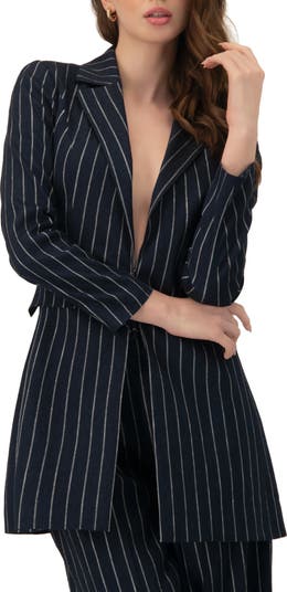 This blazer features a classic striped pattern, patch pockets, and a notched lapel.