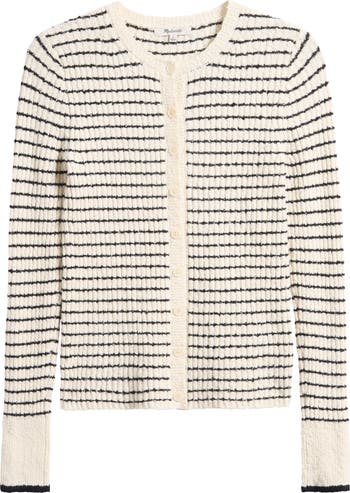 This striped crewneck cardigan is crafted from a textured cotton-blend bouclé yarn with a subtle ribbing that adds depth and dimension. Throw this flattering, on-body number on with your favorite jeans for an easy, effortless look.