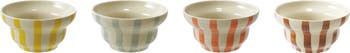 - A vibrant set of four round stoneware bowls, each hand-painted with unique multicolor stripes that bring playful charm to the table
