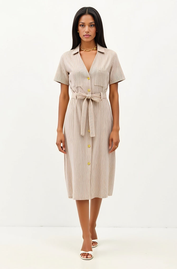This effortlessly chic midi dress features an all-over pinstripe pattern and a polished collared neckline. Designed with a button-down front and short sleeves, it includes a self-tie waist belt that enhances your silhouette while adding a tailored touch. The soft drape and midi length offer timeless elegance, perfect for work, brunch, or everyday wear.
