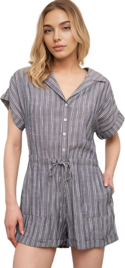 Casual, cool, and effortlessly pulled-together, this striped romper from Knit & Lounge is your one-and-done favorite for relaxed days. Made in a slate blue palette with vertical white stripes, it features a button-front bodice, notched collar, and short cuffed sleeves. A drawstring waist cinches the fit, while patch pockets add functionality. Lightweight, breathable, and endlessly wearable—this piece is perfect for everyday styling, whether you're on the go or lounging in the sun.