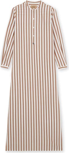 The Valery Cotton Dress is an elegant kaftan dress. This Fortela creation features a mixed linen fabric with refined brown and white stripes. Designed to drape fluidly, it includes a mandarin collar for added sophistication. Wear it as a statement piece or open over a tank and jeans. Crafted in Italy.