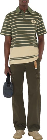 A polo shirt in cotton knitted with stripes, in the style of rugby shirts. The design is cut to a relaxed fit and appliquéd with our Knight stamp, an archival motif from the 1980s.||Button placket|Embroidered Equestrian Knight Design at chest