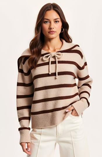 This cozy striped crewneck sweater features a wide sailor-inspired collar with an adjustable front tie for a playful yet polished touch. The soft, medium-weight knit is finished with dropped shoulders and ribbed cuffs, adding extra comfort and relaxed structure. Perfect for pairing with everything from denim to wide-leg trousers, this top blends classic nautical vibes with modern femininity. Layer it over a crisp shirt or wear solo for a chic everyday look.