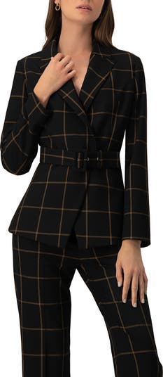 Double-breasted striped blazer featuring a lapel collar and a matching belt for a tailored fit.