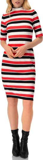 - Fitted knit midi dress with bold horizontal stripes in red, black, and white. Designed with a mock neck and short sleeves