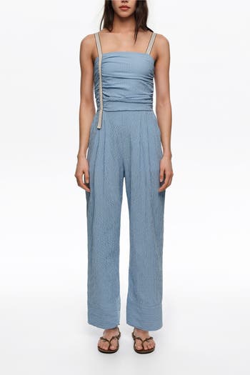 Gathered jumpsuit with a fitted waist in a textured cotton blend. Designed with a straight neckline and contrast straps