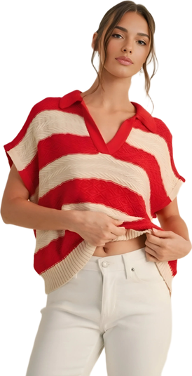 This Knit & Lounge Red and Cream Striped Knit Polo Top is a vibrant, chic take on casual knitwear. Featuring bold horizontal stripes, a soft textured knit, and a relaxed silhouette with a polo collar, this piece adds an effortlessly cool vibe to any outfit. Pair it with denim or tailored bottoms for a fresh, stylish look.
