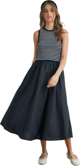 The Knit & Lounge sleeveless maxi dress offers a chic contrast of a striped knit bodice and a flowing black skirt. Its timeless design blends casual charm with feminine grace, perfect for effortless day-to-evening transitions. Pair with flats or heels for a versatile, polished look.
