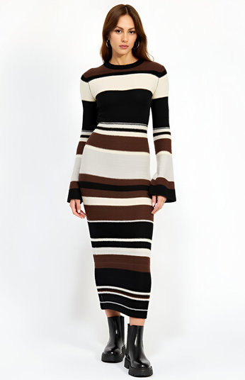 This striped knit midi dress blends modern edge with cozy sophistication. Featuring bold horizontal stripes in a rich palette, it offers a flattering body-skimming silhouette. The flared cuff detail adds movement and a fashion-forward touch, while the soft knit fabric ensures comfort. Perfect for styling with boots or heels for a versatile day-to-night look.