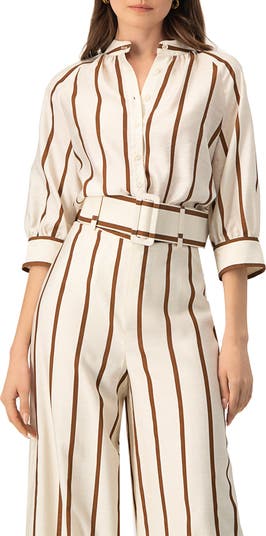 3/4 sleeve shirt with stripe print and mandarin collar neckline.