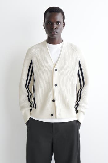 Referencing classic sportswear, this cardigan brings a preppy appeal to the daily wardrobe. This V-neck piece is open-knitted from breathable cotton and framed by double-stripe detailing and contrasting buttons. Style it with wide-leg pants.