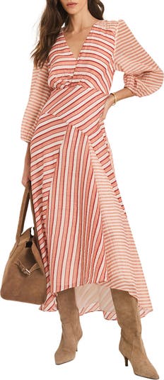 This striped midi dress is designed to flatter with its softly structured silhouette and directional detailing. Featuring a V-neckline with a twisted front, it creates a defined shape through the bodice while maintaining an effortless feel. The 3/4 length blouson sleeves add volume and balance, while the panelled skirt enhances movement and flow. Finished with an asymmetric hemline for a modern edge and a concealed side zip fastening, it is a versatile piece that transitions seamlessly from day to evening.