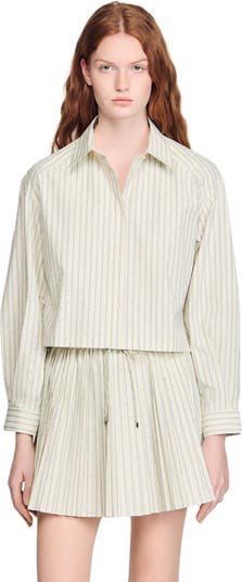 Striped shirt embellished with rhinestones, featuring a shirt collar and long sleeves with buttoned cuffs.