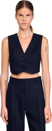 Sleeveless striped jacket-style crop top with V-neck and all-over rhinestones, featuring a buttoned front.