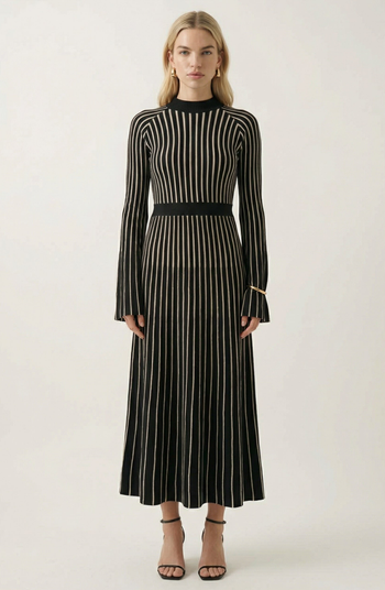 This striped rib-knit maxi dress offers a sleek and elongated silhouette, enhanced by its vertical stripe pattern. The fitted bodice flows into a gently flared skirt, creating a flattering shape that moves effortlessly. Long sleeves and a mock neckline add refined coverage, while the soft knit fabric ensures comfort throughout the day. Pair with strappy heels for an elevated evening look or ankle boots for a chic daytime outfit.