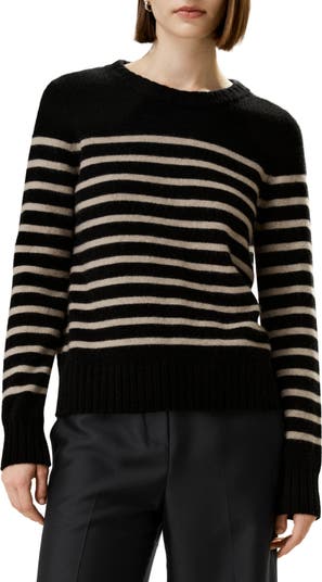 Boasting in mariner stripes, this 100% baby soft cashmere garment features a timeless ribbed round neck collar and hemline, making it a truly remarkable piece to add to any collection.