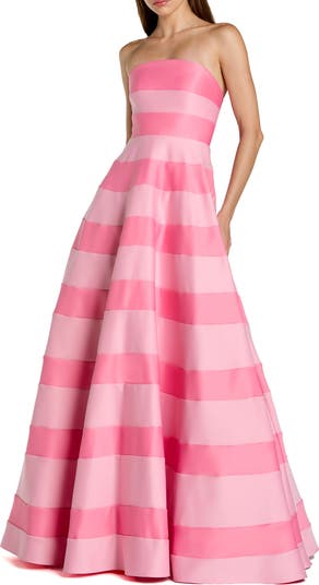 Sleek striped satin brings striking dimension to this strapless ballgown, complete with a full, dramatic silhouette and pockets for effortless sophistication.