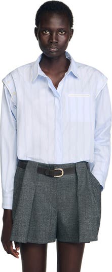 Striped shirt with contrasting edges, featuring a slightly rounded shirt collar, hidden button placket, and shoulder buttons to reveal the shoulders.