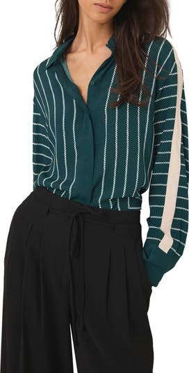 This striped shirt offers a modern, relaxed take on a timeless wardrobe essential. Designed with a classic pointed collar and button-front closure, it features a vertical stripe pattern and subtle contrast detailing along the sleeves for added visual interest. The easy, fluid silhouette drapes effortlessly for all-day comfort while maintaining a polished look. Perfect for pairing with tailored trousers, skirts, or denim, this versatile shirt delivers effortless sophistication for both work and off-duty styling.