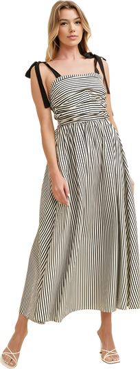 Make a timeless statement with this Knit & Lounge black and white striped maxi dress. Featuring delicate shoulder tie straps, a fitted bodice, and a flowing A-line silhouette, this dress effortlessly blends modern charm with classic elegance. The soft fabric and practical pockets add a touch of comfort and functionality.