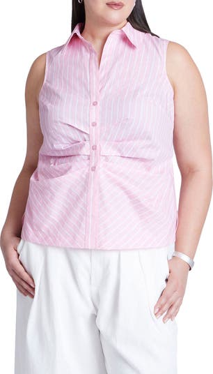 Ruching at the waist adds light texture to this crisp cotton button-up done in a sleeveless silhouette for warm weather and layer-ready style.