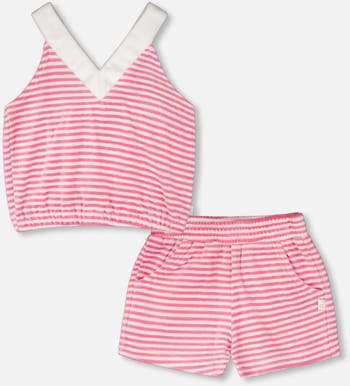 The striped terry cloth top and short set white and pink is made for sunny days and endless play. This set features a sleeveless top with wide straps, a V-shaped neckline, and a bottom elastic hem, while the matching shorts come with an elastic waistband and side pockets for added comfort. Made from soft striped terry cloth, this set combines texture, stretch, and summery sweetness for girls on the go.
