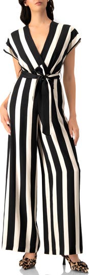 Sleeveless wide-leg striped jumpsuit featuring a stylish off-shoulder design, V-neckline, and a waist tie for a flattering fit.