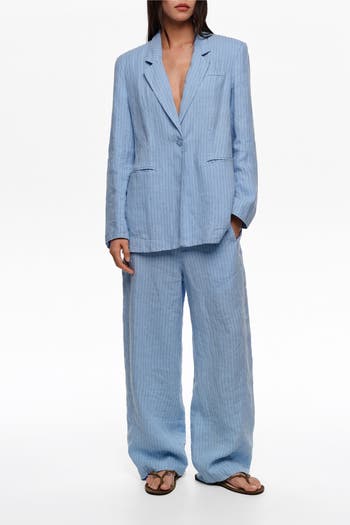 Double-breasted tailored jacket in 100% linen. Designed with a lapel neckline, button-up front, straight long sleeves, and flap pockets