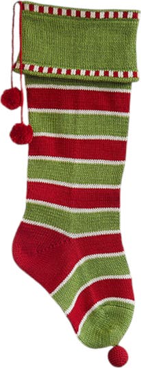 Bring a burst of festive color to your holiday decor with this vibrant knit holiday stocking. Featuring bold red and green stripes, this stocking captures the essence of the Christmas season in a playful and joyful design. The ribbed cuff at the top is accented with a charming red and ivory striped trim, adding an extra touch of holiday cheer. Red pom-poms from the cuff and toe complete the look, giving this stocking a fun and whimsical flair. Perfect for hanging by the fireplace, this stocking is as functional as it is decorative, offering plenty of room for treats, small gifts, and holiday surprises. The durable cotton weave ensures that this stocking will become a cherished part of your holiday traditions for years to come.