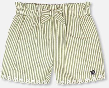 The shorts in green and off white stripes with embroidery bring a chic twist to casual wear. These bottoms are designed with delicate embroidered bottom hems, an adjustable tie at the waist, and a breezy striped fabric that gives both comfort and style. Made from a soft polyester and cotton blend, they are ideal for pairing with any top from the “Under My Straw Hat” collection.