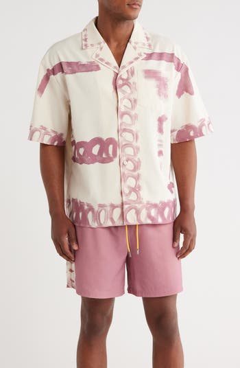 A breezy cotton-and-linen blend keeps you feeling cool in this boxy camp shirt featuring brushstroke-inspired patterning.