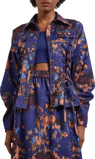 Corset-inspired lacing lets you cinch up the waist of this office-ready jacket that looks structured even when worn in a relaxed, open style.