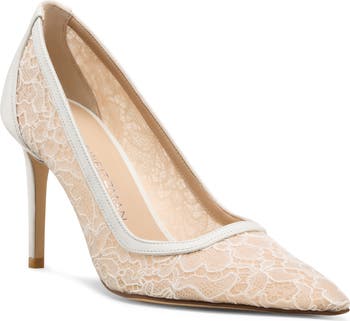 Alençon lace layered over nude leather lets you go elegant or flirty in a tall, streamlined pump that holds the power to elevate any ensemble. Wear it to soften business attire, brighten a sunny-day reception or take a romantic dinner to the next level.