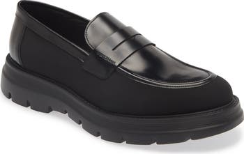 Glossy leather and stretchy fabric further elevate the kicked-up stature of a penny loafer that pairs a classic apron toe with a chunky rubber sole.