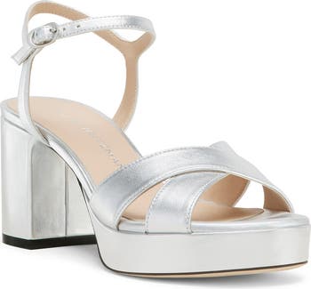 Channel unmistakable retro glamour in this shimmery metallic sandal featuring a slim ankle strap and platform sole.