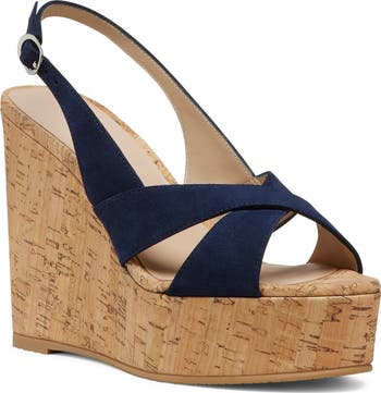 A cork-textured wedge and platform bring earthy style to a slingback sandal that takes your weekend look up a notch.