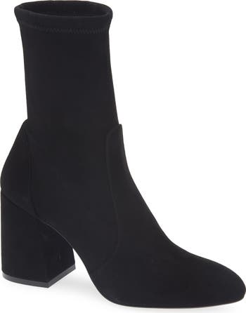 A stretchy shaft offers a flexible, custom fit for this wardrobe-essential bootie made in a sleek silhouette framed with an almond toe and chunky flared heel.