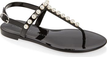 The jelly sandals of the past get updated for today with a regimented row of pearly beads trimming the slim straps.